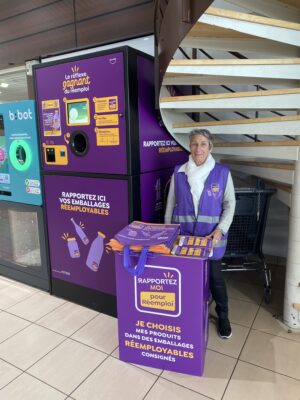 En rayon, la couleur violette permet d’identifier rapidement les emballages concernés, ainsi que les automates où déposer les contenants vides pour récupérer le montant de la consigne payée par le consommateur au moment de l’achat (souvent en entrée de magasin).
