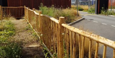 Avant, c’était une clôture en bois (photo ci-contre) conçue de manière industrielle. Avec le temps, elle a pris un air penché… et ne remplissait plus son office. La clôture avait donc besoin de retrouver de la solidité, de la résistance. Et pourquoi pas utiliser des déchets végétaux ? Trivalis en a rêvé, Terra Aménité l’a fait. Depuis juillet, des branches de châtaigner sont aménagées ici et là, et s’étendent sur 160 mètres. En plus, le grillage à mouton, fixé au bois, vient freiner toute idée d’intrusion.
